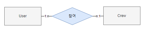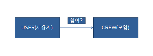 - User(사용자) 는 1개의 Crew(모임) 에 참여 할 수 있다.