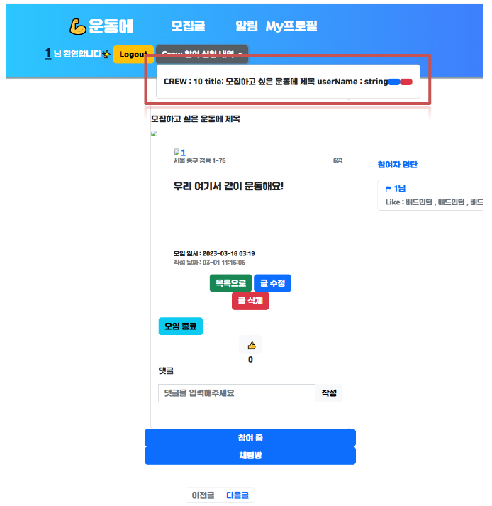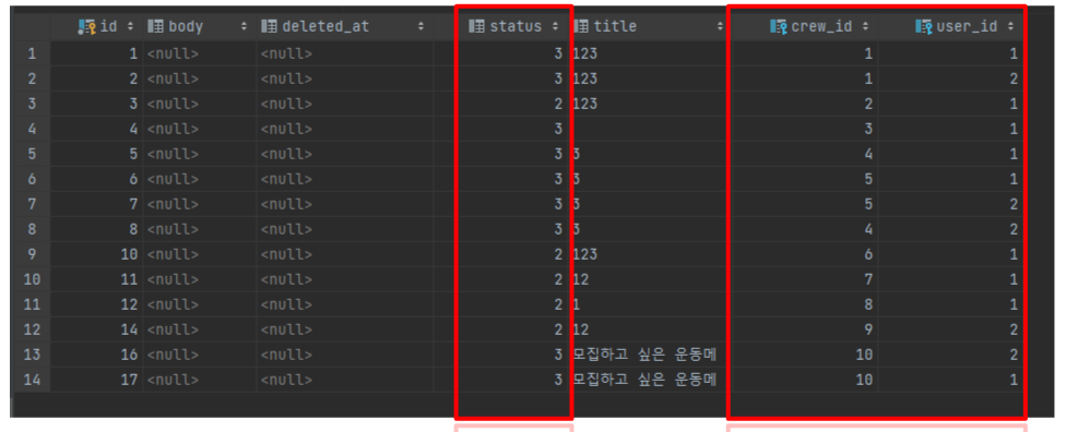 - status 는 현재 상태를 나타냄 (1: 승인대기, 2: 참여중, 3: 모임종료상태)